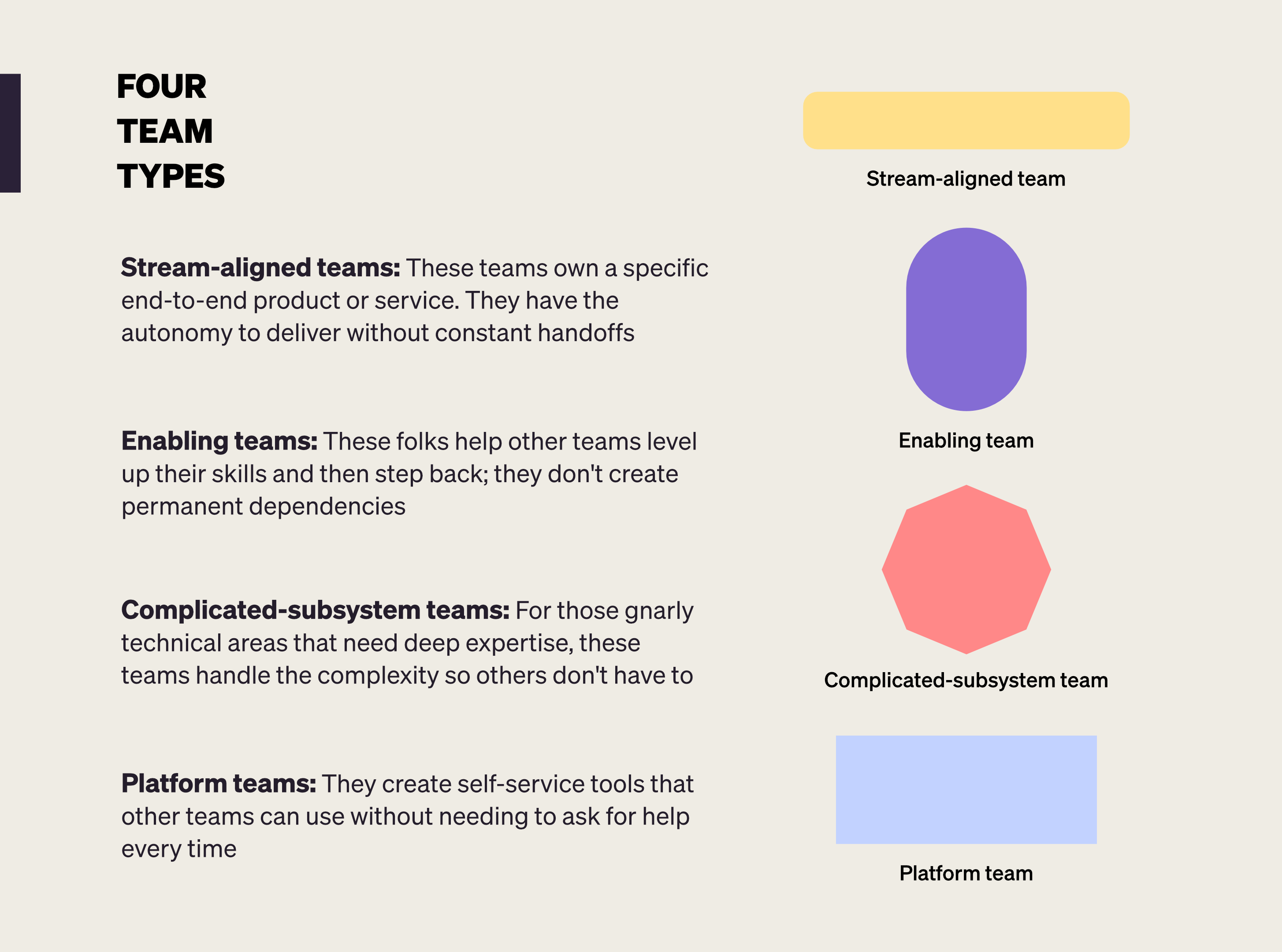 Instead of the typical ‘throw everyone together and hope for the best’ approach, Team Topologies gives you four team types that each serve a specific purpose: