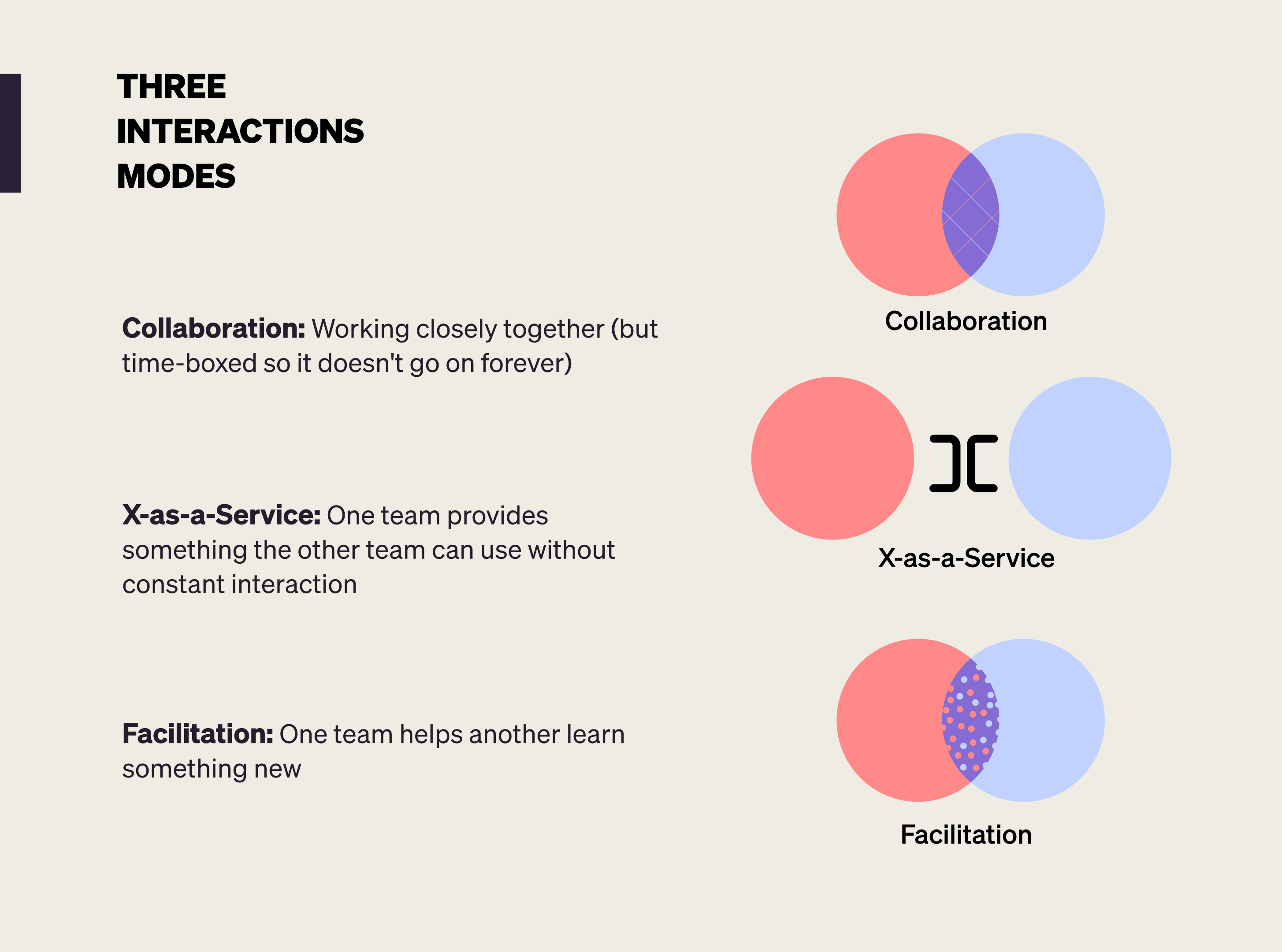 Team Topologies also help you to be intentional about how teams interact. There are three main modes: